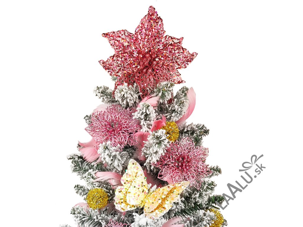 Špičku stromčeka zdobí luxusný kvet s glitrami.