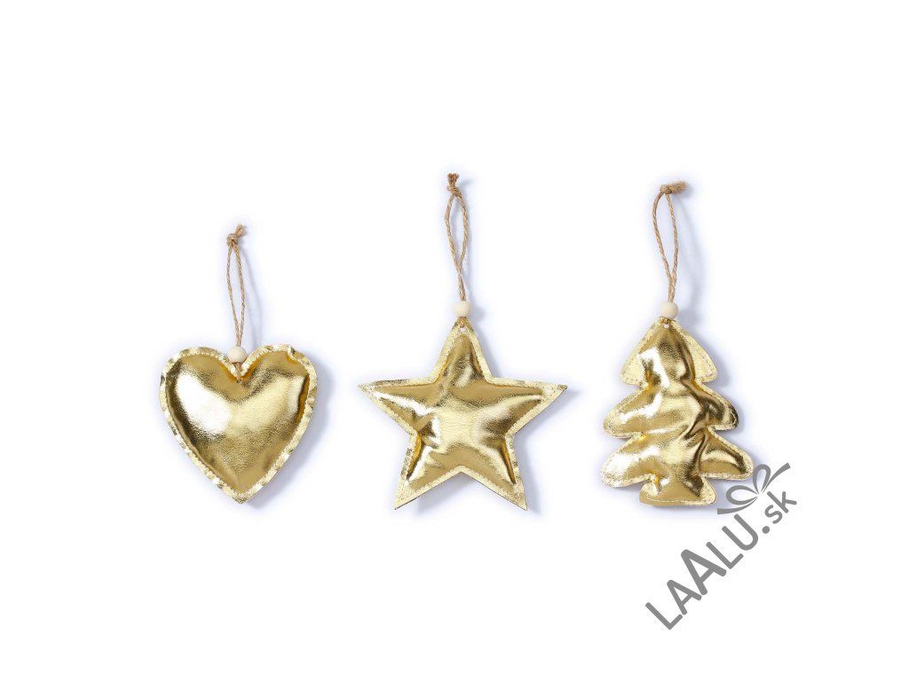 Sada 3 ks textilných ozdôb v zlatej farbe s motívom srdiečka, hviezdy a stromčeka.