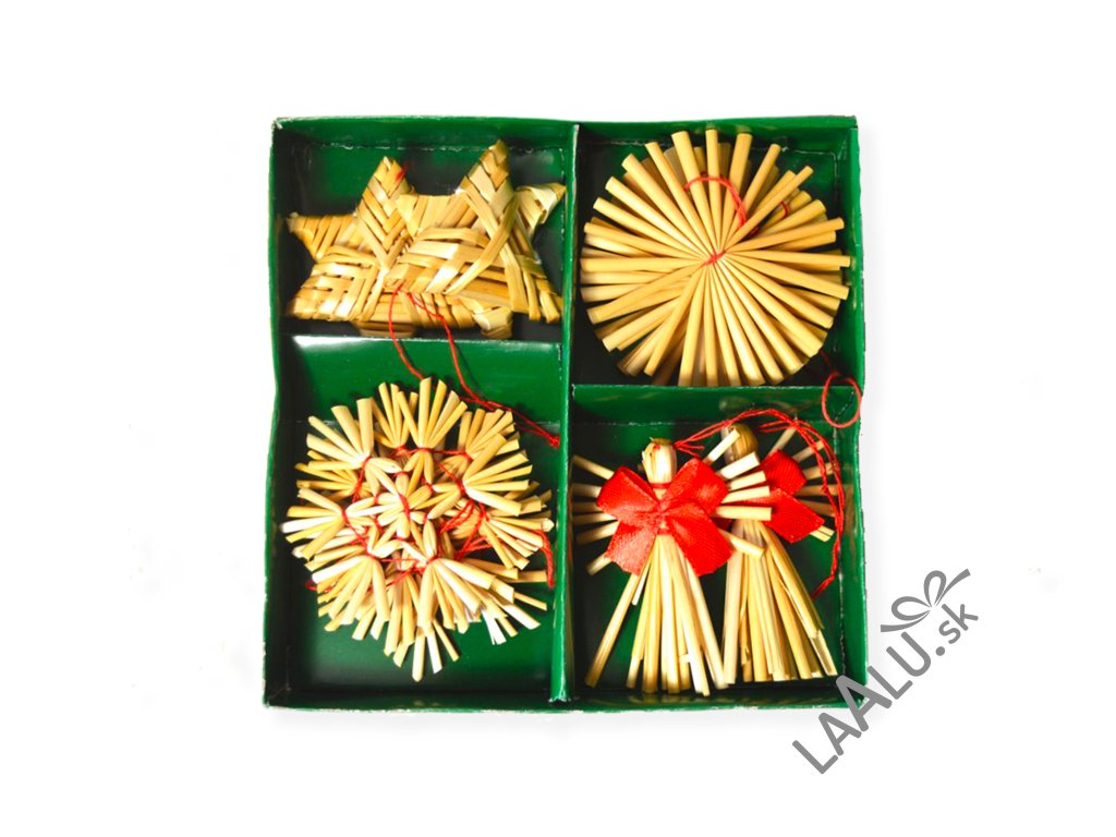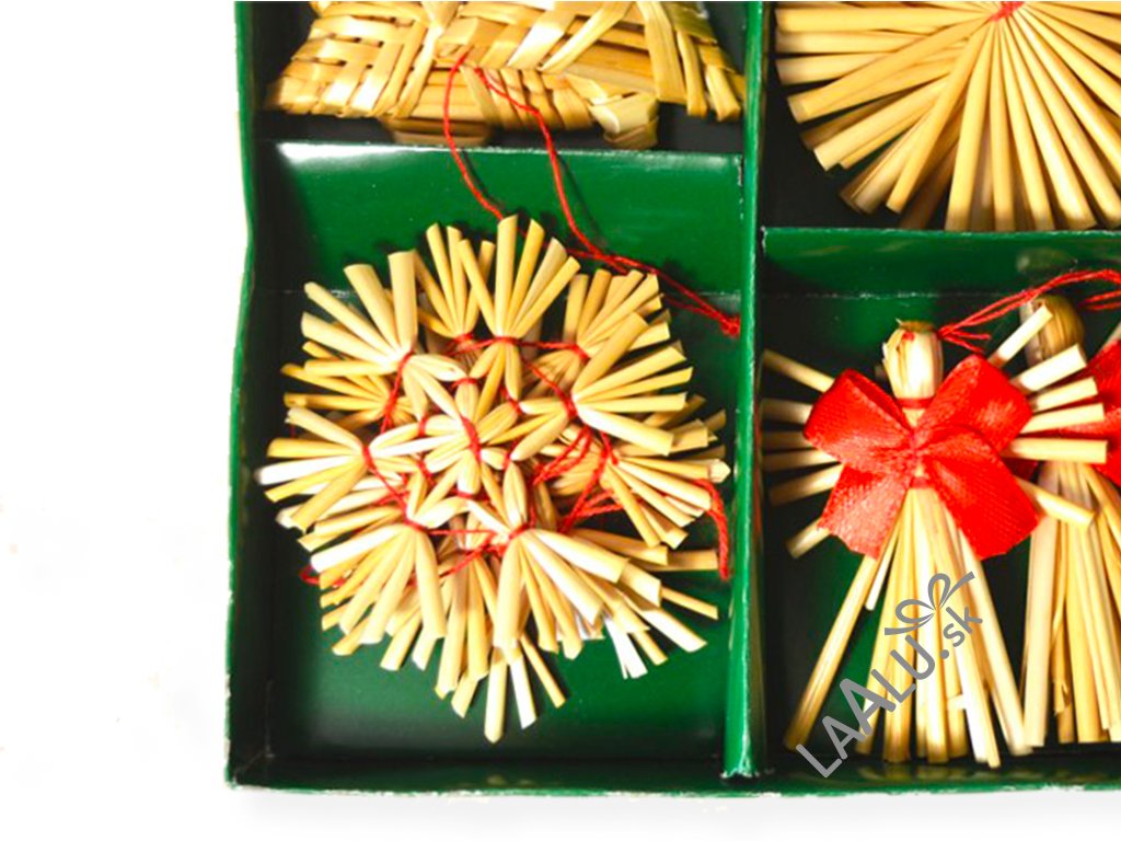 Sada 24 ks slamených ozdôb s rôznymi motívmi.