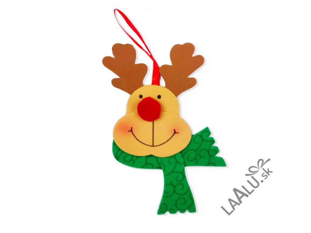 Textilné ozdoby na stromček v podobe sobov s červeným nosom a šálom.