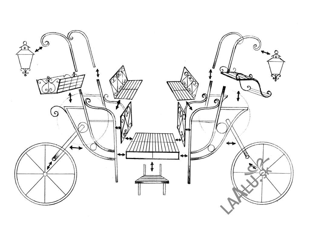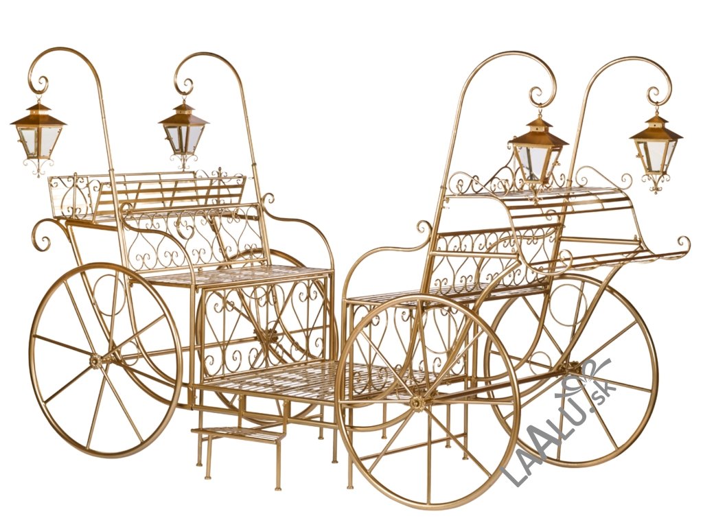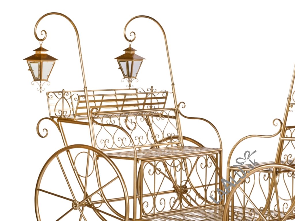 Tento otvorený kočiar, vyrobený z kovu, je zdobený elegantnými špirálovitými ornamentmi a dvoma štýlovými lampášmi na každej strane, ktoré evokujú starobylú vianočnú romantiku.