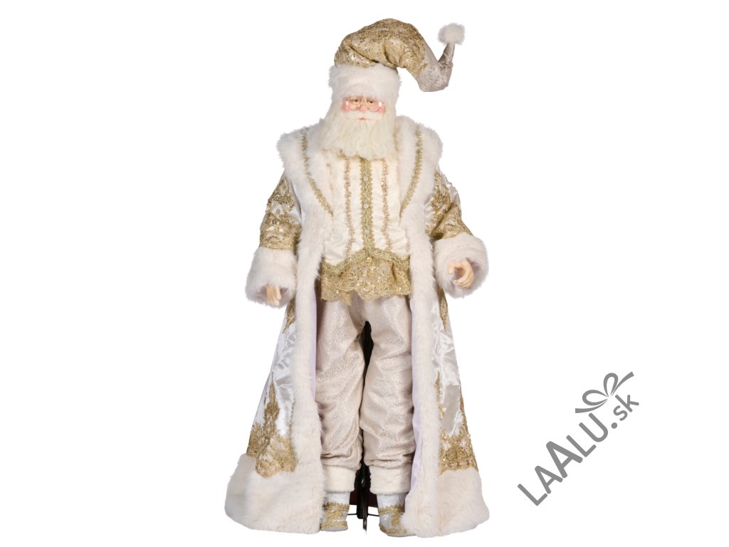Súprava zahŕňa majestátnu postavu Santy v životnej veľkosti s výškou 163 cm, ktorý je oblečený do kráľovského rúcha v krémovej a zlatej farbe.
