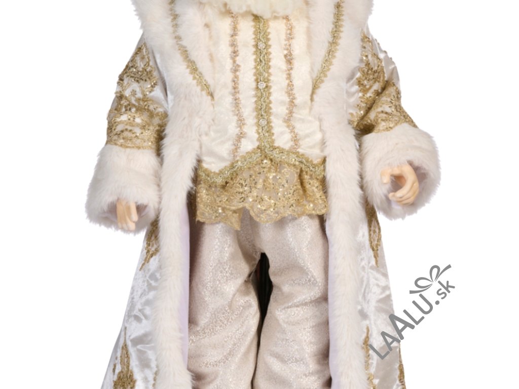 Jeho dlhý plášť s kožušinovým lemom a bohatými zlatými ornamentmi, doplnený trblietavou čiapkou s bielym brmbolcom, vyžaruje noblesu a vianočné kúzlo.