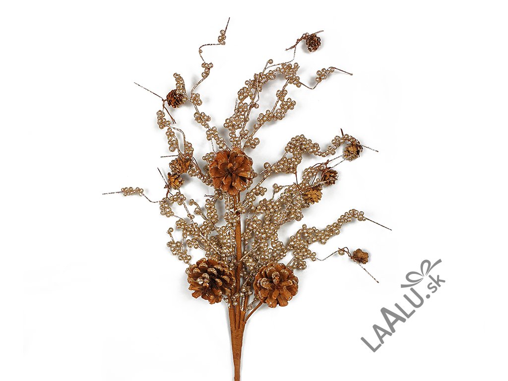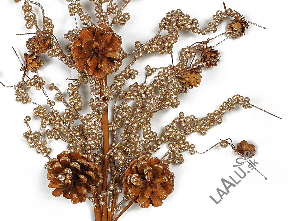 Umelá dekorácia v podobe vetvičky, ktorá je tvorená zlatými bobuľami a borovicovými šiškami.