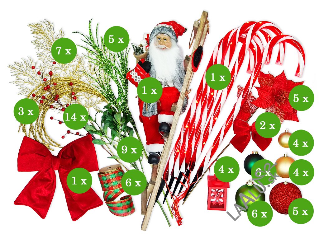 Obsahuje pestrú paletu vianočných symbolov a dekorácií napr.: dekoračné vetvičky, stuhy, svetelné cukrové paličky.