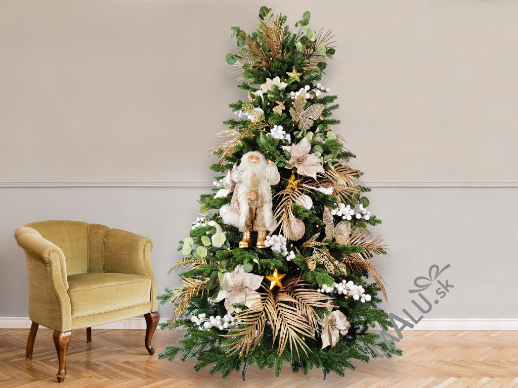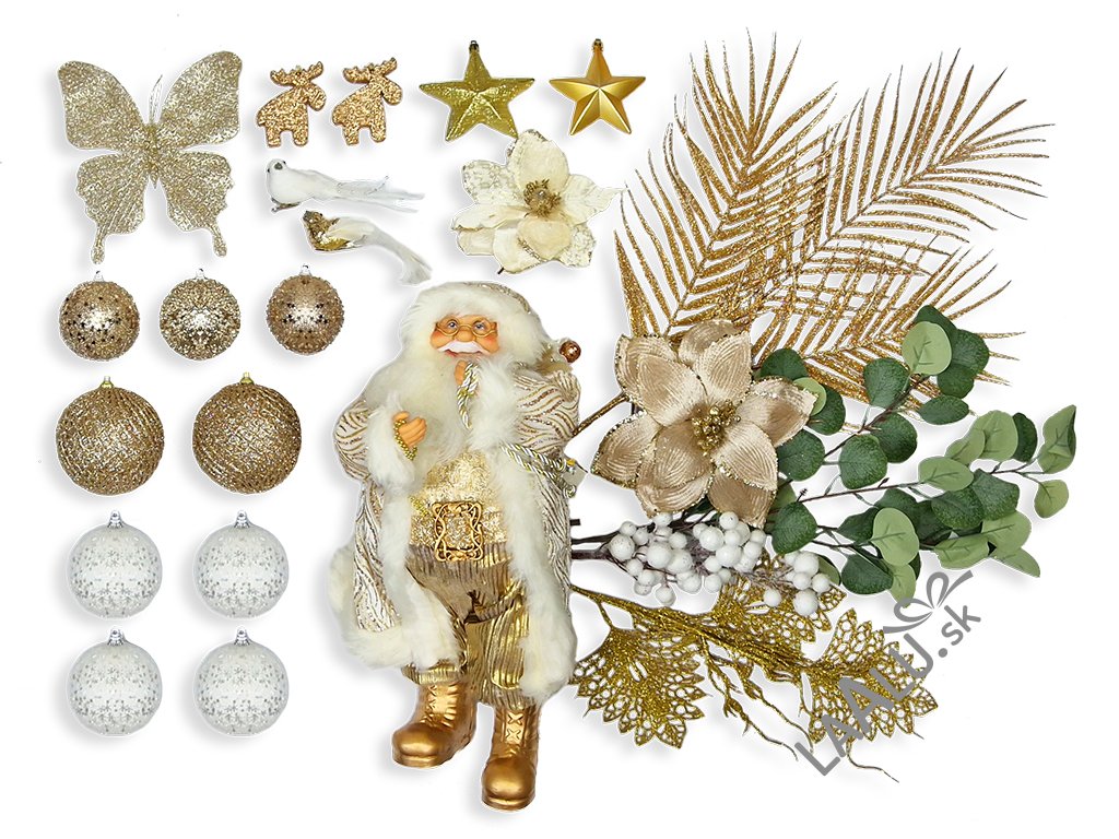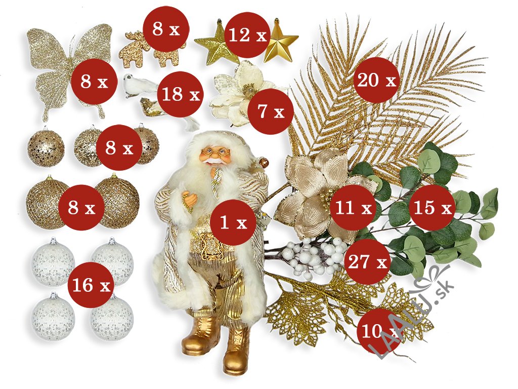 Táto sada je zložená z veľkého množstva dekorácií ako sú napr.: palmové listy, vetvičky eukalyptu, motýliky. V sade nájdete klasické okrúhle ozdoby a nadčasové rastlinné dekorácie. Dekoračnéchampagne listy, spoločne s bielou a zelenou farbou dodajú stromčeku moderný a luxusný vzhľad. Špičku stromčeka tvorí skladba palmových a obľúbených eukalyptových listov. Dominantnou ozdobou je postavička zlatého Santa Clausa s výškou 47 cm. Stromček s touto sadou ozdôb pôsobí sviežo a zároveň veľmi elegantne.