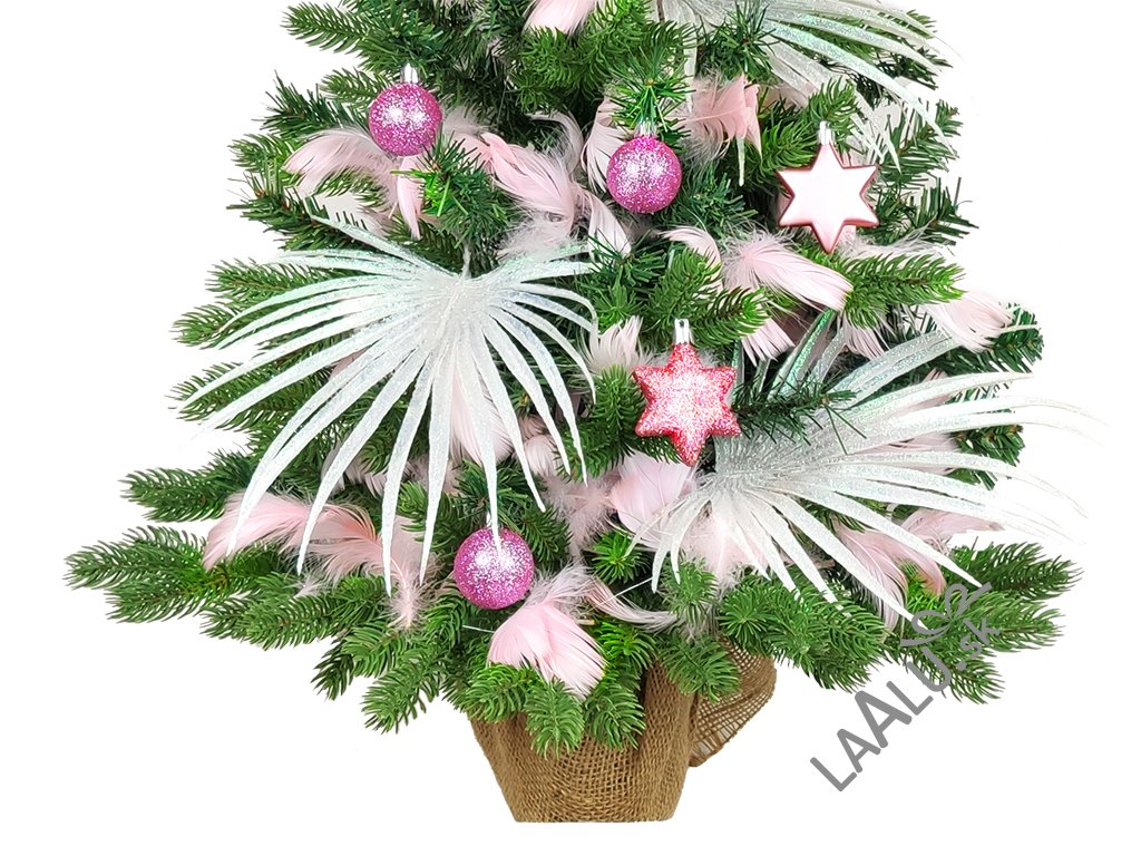 Celým stromčekom je prepletené perie vo svetlo ružovom nádychu, ktoré dopĺňajú luxusné biele listy s glitrami.