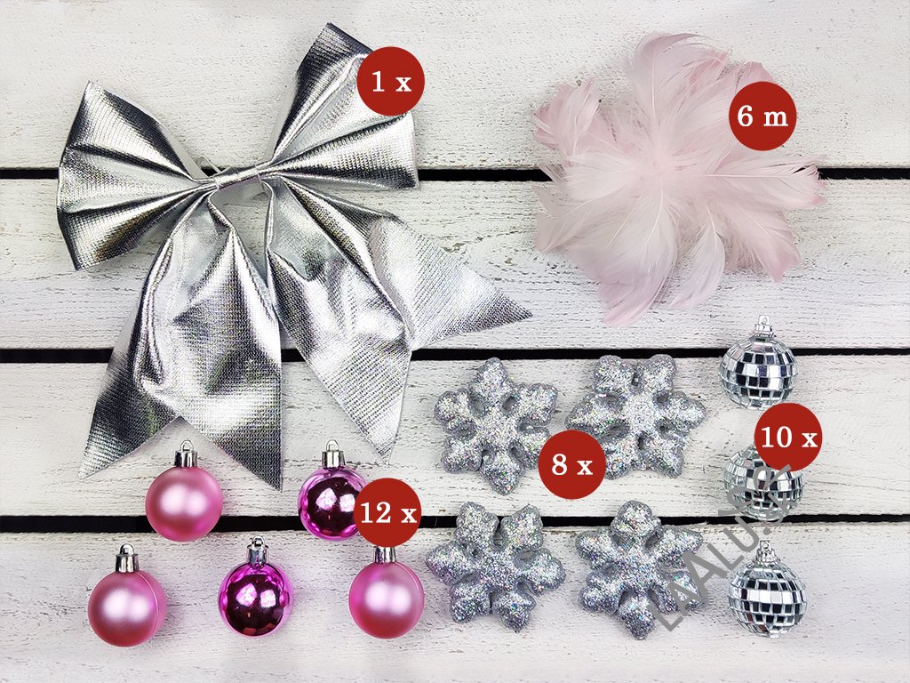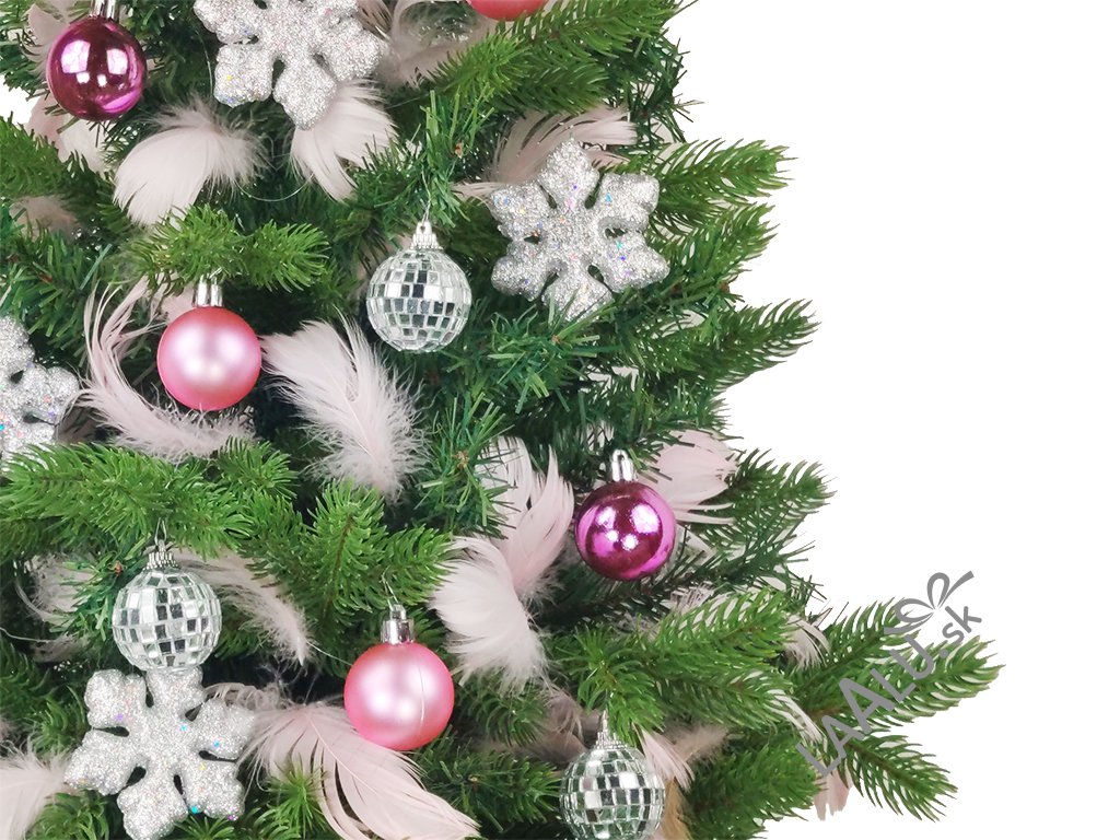 Celým stromčekom je prepletené perie vo svetlo ružovom nádychu, ktoré dopĺňajú vločky a okrúhle ozdôbky.