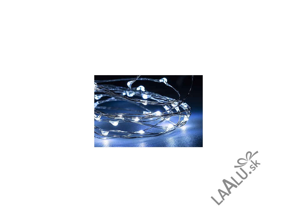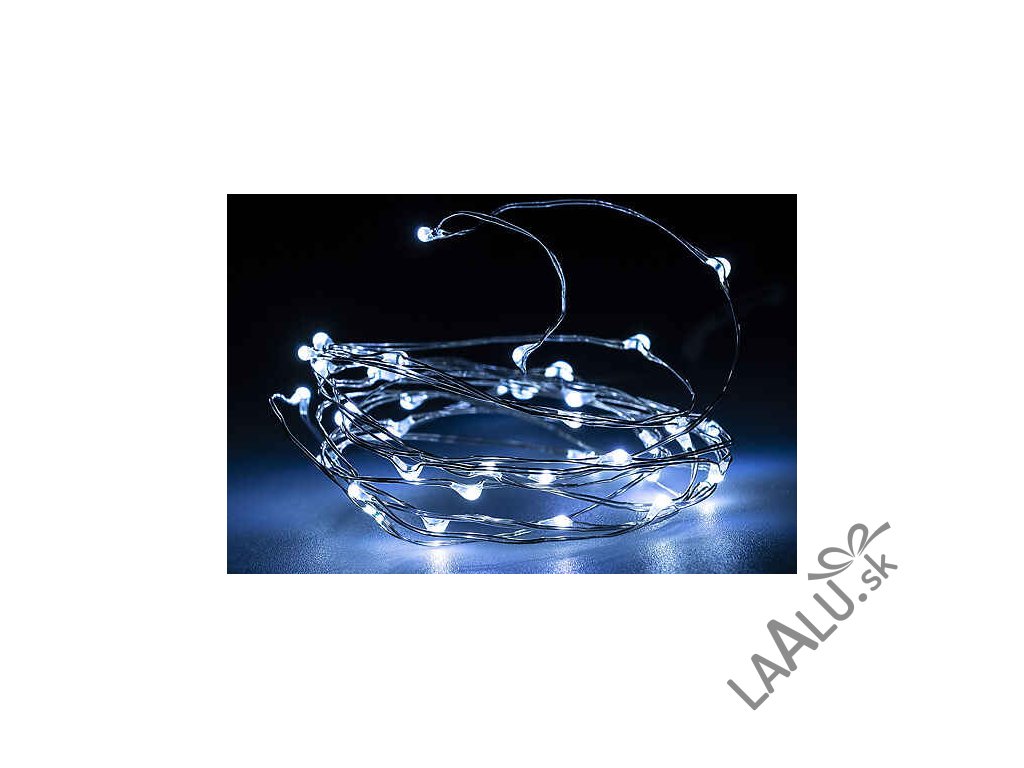 Drôtik je strieborný s LED diódami, ktoré tvoria studené biele svetlo.