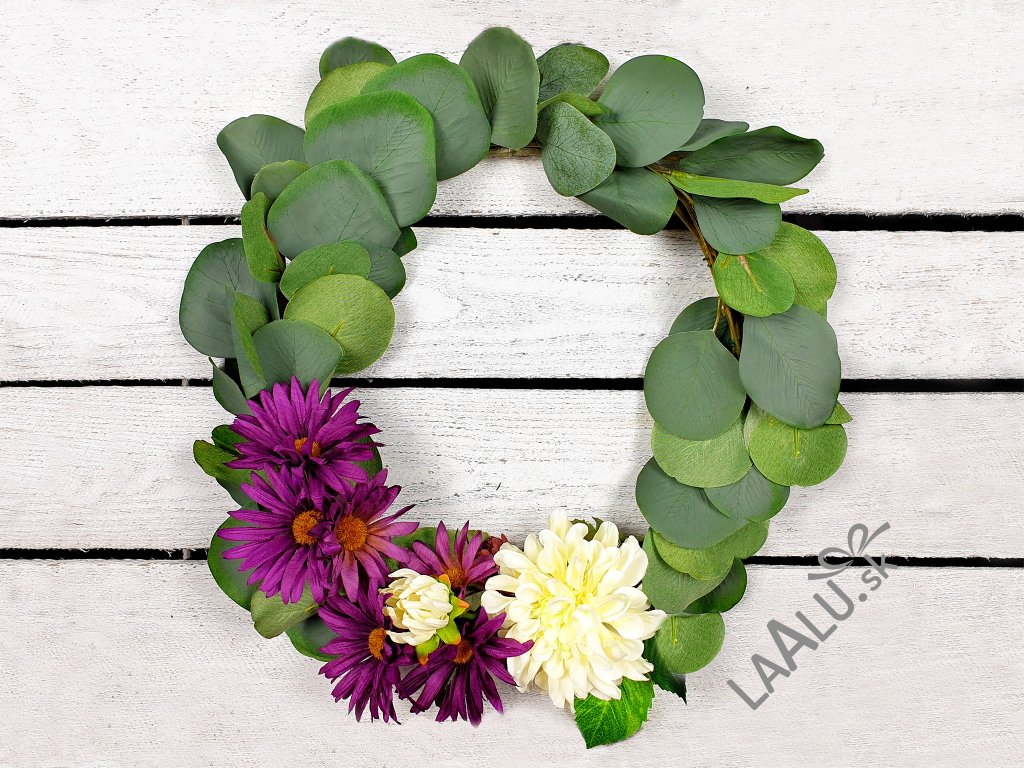 Veniec 33 cm s eukalyptovými listami, fialovými a bielymi kvetmi.